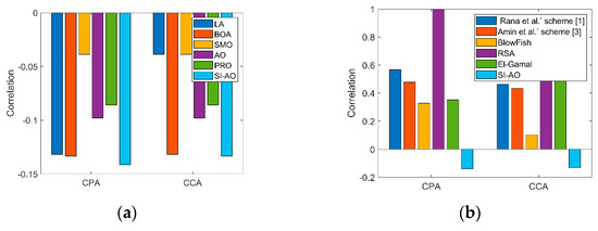 The statistical analysis of the proposed SI-AO method was computed compared to the traditional models for fitness function and key sensitivity, and the results are depicted in Table 5 and Table 6. As seen in Table 5, the best-case scenario showed an improvement in the proposed SI-AO model, which was −17.73%, −13.60%, −17.73%, −12.60%, and −17.31% better than the traditional models LA, BOA, SMO, AO, and PRO, respectively. The mean performance of the adopted SI-AO approach for key sensitivity showed better results than the traditional schemes. As a result, the improvement in the proposed SI-AO model has been validated effectively in all cases.