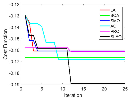 Table 3 shows the analysis regarding computation time, and Table 4 shows the analysis of computation cost. These aspects were analyzed to prove the enhanced performance of the employed SI-AO approach in contrast to traditional methods. The conservative schemes considered here were LA, BOA, SMO, AO, and PRO. Computation time must be minimal for superior system performance. The proposed SI-AO scheme achieved negligible improvement over the LA, BOA, SMO, AO, and PRO methods. Next to SI-AO, the AO model had the lowest computation time values compared to the LA, BOA, SMO, and PRO schemes. Similarly, the developed SI-AO scheme gained smaller computation cost values over the LA, BOA, SMO, AO, and PRO methods. Namely, a minimal computation cost value of −0.18931 was gained by the SI-AO model, which was negligible compared to the values gained by the LA, BOA, SMO, AO, and PRO methods. Thus, the enhancement of the adopted scheme was proven.