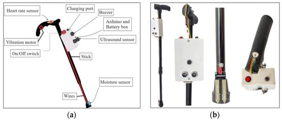 - Balasubramani, S.; Mahesh Rao, E.; Abdul Azeem, S.; Venkatesh, N. Design IoT-Based Blind Stick for Visually Disabled Persons. In Proceedings of the International Conference on Computing, Communication, Electrical and Biomedical Systems, Coimbatore, India, 25–26 March 2021; pp. 385–396. [Google Scholar]