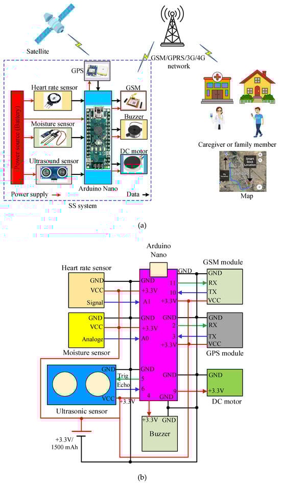 The illustration in Figure 2a depicts the SS system’s whole configuration, highlighting its components’ hardware and interconnection, while Figure 2b shows the wire connections of the SS system. Figure 2b illustrates the wire connection of all components with the Arduino Nano microcontroller. The sensors, including ultrasonic, moisture, heart rate, and wireless technology encompassing GPS and GSM, are connected to the Arduino Nano microcontroller and a Buzzer and coin vibration motor. The moisture and heart rate sensors are connected to the Arduino Nano over three wires—two for the power supply and one for the measurement signal—to measure the ground conditions and VIP’s heartbeat, respectively. The ultrasonic sensor is linked over four wires—two for power supply, one for trigger output signal from the Arduino Nano, and one for input echo signal to the Arduino—to measure the distances among the obstacles and VIP. The GPS and GSM modules are connected through four wires—two for power supply, one for transmitting, and one for receiving data. The GPS module receives the VIP’s position coordinates and transmits them as a message to the caregiver’s or family member’s mobile phone via the GSM module. The coin vibration motor and Buzzer are connected to the Arduino Nano over two wires—one ground wire and the other for turning on/off. All components are battery-powered by a 3.3 V, 1500 mAh using a lithium-ion battery. The explanation of the main components of the SS system is detailed as follows: