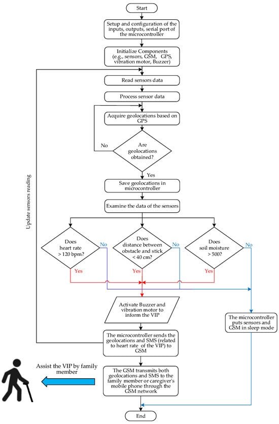 - The stored sensor data underwent testing. If the heart rate exceeded 120 bpm, an obstacle was identified within a distance less than 40 cm, or if the soil moisture level surpassed 500, the microcontroller activated a Buzzer and DC vibration motor to alert the VIP to their health and environmental conditions. Otherwise, the microcontroller transitioned the sensors and GSM into sleep mode to conserve energy for the SS system. A timestep of 3 s was configured to process the data acquired from the sensors. This time was selected to provide the blind person with a real-time warning signal in the form of sound or vibration and enable him/her to take necessary action.