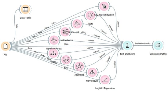 In this study, an assessment was conducted on ten ML algorithms to identify the most effective one with superior performance compared to others. The evaluated algorithms encompass CN2 Rule Induction, k-nearest Neighbors (kNN), Gradient Boosting, Neural Network, Random Forest, Decision Tree, SVM, Adaptive Boosting (AdaBoost), Naïve Bayes, and Logistic Regression as shown in Figure 5. The Orange software served as the implementation software for these algorithms. The evaluation process consisted of two phases: the training phase and the cross-validation phase. An amount of 3000 out of 4000 data samples were allocated for training, while the remaining 1000 were reserved for cross-validation. The training and validation iterations were set to 100. Input data for the algorithms included measurements from three sensors: heart rate measured in bpm (1333 samples), distance measured in centimeters (1333 samples), and moisture measured in integer values. The target (output) of the ML algorithms is a binary alert (1 or 0). This output functions as a digital signal to activate the Buzzer and DC vibration motor to work in order to alert the VIP that one of the environmental or health conditions is abnormal. The objective for testing several ML algorithms was to determine the algorithm that exhibits optimal performance across various criteria, contributing to informed decision making in the study context. These algorithms cover a broad spectrum of ML approaches, each with strengths and weaknesses, making them suitable for different tasks and datasets. The hyperparameters of the adopted ML algorithms are presented in Table 1.