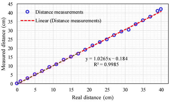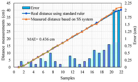 The number of samples was plotted on the x-axis, and both system’s distance measurements were plotted on the left y-axis. Nevertheless, the errors at each sample point are plotted on the right y-axis, as in the blue bar chart. It is observed that the distance measurement error increases to more than 2 cm, particularly when the distance between SS and the obstacles is more than 40 cm. This means the SS system works well at distances less than 40 cm. However, a close agreement between the measurements of both systems was achieved. The SS system demonstrates a mean absolute error (MAE) of 0.436 cm relative to the real measurements. Looking closely, we will see a slight difference that the correlation coefficient in Figure 8 can evaluate. In Figure 8, the data points representing real distance on the x-axis (obtained from ruler measurements) and measured distance of the SS system on the y-axis (obtained from our system using the ultrasound sensor) exhibit extraordinary consistency. The correlation coefficient achieved is 0.9985, indicating a strong correlation between the two sets of measurements.