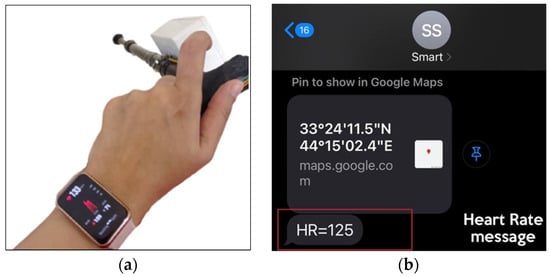 Heart rate measurements were obtained using a heart rate sensor (SEN-11574). Upon completing the component setup, the SS system measures heart rate by capturing the heartbeats of the VIP. The VIP position their finger on the stick where the heart rate sensor is attached. Following that, the heart rate sensor captures the pulse of the VIP and sends the measurements to the Arduino microcontroller. The microcontroller then relays the measured data to the family member’s mobile phone via GSM. To validate the accuracy of the heart rate sensor, a comparison is made with a benchmark device (smartwatch), where the benchmark device is connected to the VIP’s wrist, as depicted in Figure 9a. Figure 9b displays the heart rate measurements captured by the SS system. Both systems simultaneously collect heart rate data.