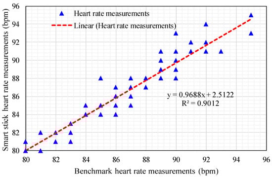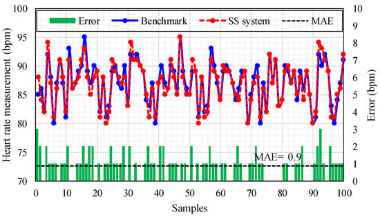 Figure 10 illustrates heart rate measurements for both the benchmark and the heart rate sensor of the SS system across 100 sample measurements. The x-axis represents the number of samples, while the left y-axis depicts heart rate measurements in beats per minute (bpm) for both systems. The blue line with circles points to the benchmark measurements, while the red dashed line with circles indicates the SS measurements. Concurrently, the errors at each sample point are displayed on the right y-axis—the error changes between 0 and 3 bpm (green bar) for the adopted 100 samples. Notably, there is a close agreement between the measurements of both systems, with the SS system demonstrating a mean absolute error (MAE) of 0.9 bpm (dashed black line) relative to the benchmark measurements. Upon closer examination in Figure 11, the correlation coefficient is employed to evaluate the differences. The x-axis represents data points representing heart rate measurements of the benchmark, while the y-axis depicts heart rate measurements of the SS system. The data points (blue triangles) exhibit a high degree of consistency, with a correlation coefficient of 0.901, signifying a good correlation between the two sets of measurements.