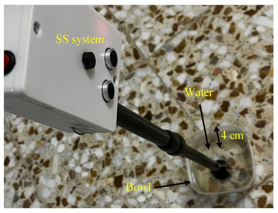 The moisture measurements were achieved based on a moisture sensor YL-69. The moisture sensor plays a crucial role for VIP by enhancing their environmental awareness and safety. By detecting and continuously monitoring moisture levels in the surrounding soil, the sensor enables these individuals to assess the ground conditions they are navigating. This information becomes especially vital when fluctuations in moisture may signal potential hazards, such as slippery surfaces or uneven terrains. The sensor’s ability to notify users about changes in soil moisture levels empowers them to make informed decisions, navigate safely, and proactively avoid potential obstacles. Upon receiving a moisture notification, the VIP can detect the vibration motor on the SS grip or receive a sound alert. Figure 12 demonstrates a sample testing arrangement, highlighting moisture measurements conducted with a plastic bowl containing water with a depth of 4 cm.
