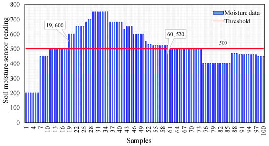 Figure 13 depicts the soil moisture sensor readings for 100 samples, ranging from 200 to 750, as an integer unit. A threshold value of 500 (red line) was set, and when the sensor reading exceeded this threshold, the microcontroller activated both the Buzzer and the vibration motor. Conversely, when the sensor reading fell below 500, the Buzzer and the vibration motor remained in the off state. Figure 13 reveals that the Buzzer and the vibration motor operated only between samples 19 to 60 (i.e., wet ground), corresponding to sensor readings between 600 and 520 (more than threshold level, i.e., 500), and the Buzzer and the vibration motor remained in the off state for the remaining samples and sensor readings (i.e., less than threshold level, i.e., 500).