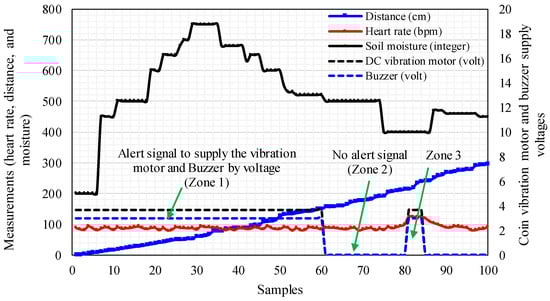 Figure 14 serves as a visual representation of an SS system designed to monitor and respond to certain physiological and environmental parameters. The figure provides a comprehensive overview of how the system assesses heart rate, distance, and moisture levels, which are crucial metrics in this context. The SS system uses sensors to measure heart rate, distance, and moisture, and these measurements play a critical role in determining the appropriate response. Predefined threshold values for each parameter in SS (i.e., 40 cm for distance, 120 bpm for heart rate, and 500 integer value for humidity) act as metrics to determine when these metrics enter the critical zone. Accordingly, if one or more sensors crosses a threshold level, the microcontroller activates a coin vibration motor and the Buzzer. Otherwise, if one or more than one sensor stays below the threshold level, it shuts down the motor and Buzzer, thereby ensuring that those with visual limitations can be promptly notified when certain physiological or environmental conditions reach critical points.