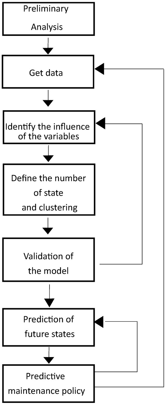 Figure 1. The initial two steps pertain to data collection, while the third step involves identifying critical parameters, conducting a preliminary analysis to consider fault-variable relationships. Subsequently, an accuracy analysis determines the optimal number of fault clusters. The fifth step involves validating the predictive maintenance approach using a subset of available data (training set). The final two steps focus on formulating an intervention policy for predictive maintenance.