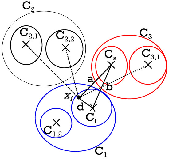 , each data point is assigned to the class with the nearest centroid based on the Euclidean distance. At each step, the centroids are recalculated, and the process continues by reassigning each point to the closest cluster as described in (