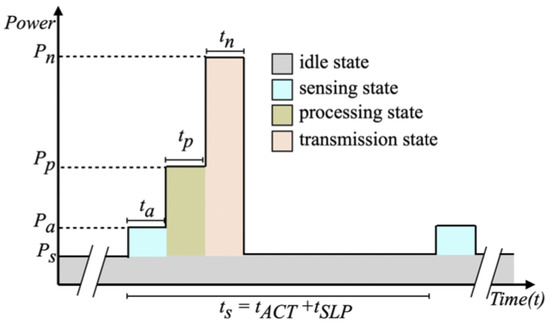 Most research on power models and energy-aware design has focused on transmission techniques or protocols. In addition, the process in one cycle consists of active, , and sleep, , periods (). The active period consists of senseing state (), processing state (), and transmission state (). Hence, the active period (). Using low-power equipment and technologies and effective power management techniques may reduce the power consumption of both the node and the wireless transmission component.