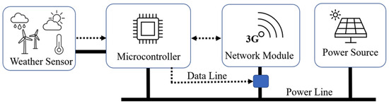 The system architecture of the IoT weather station. The data line is represented with the dotted line to turn the network module on/off via relay.