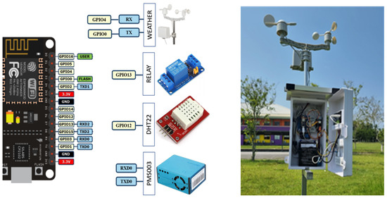 This experiment utilized the IoT devices based on the system architecture depicted in Figure 2. The testbed was implemented using the ESP8266 or NodeMCU board, with the firmware developed in C-sketch programming language. The ESP8266 had a 32-bit microcontroller, 80 MHz clock speed, 4 kB flash memory, 64 kB RAM, WiFi IEEE802.11b/g/n, and a C to 125 C temperature range. The NodeMCU’s voltage was 3.3 V. The weather sensor comprised DHT22 for humidity and temperature monitoring, PMS7003 for pm 1.0 and 2.5 monitoring, wind speed with direction, and rain gauge. Three sensors, wind, rain gauge, and PMS7003, were connected via RS232. The voltage of these sensors was 3.3 V, and they related to the digital pin and the 5.0 V pin. Additionally, a relay was connected between ESP8266 and the network module’s power line. The IoT device is connected to the Internet via Wi-Fi, connected to a 4G IoT gateway. The power source was solar power connected to the solar cell and battery of 12 V 500 A. Figure 3 illustrates the connection between the ESP8266 microcontroller and its sensor, while the right-hand side shows its installation in the sensor field.