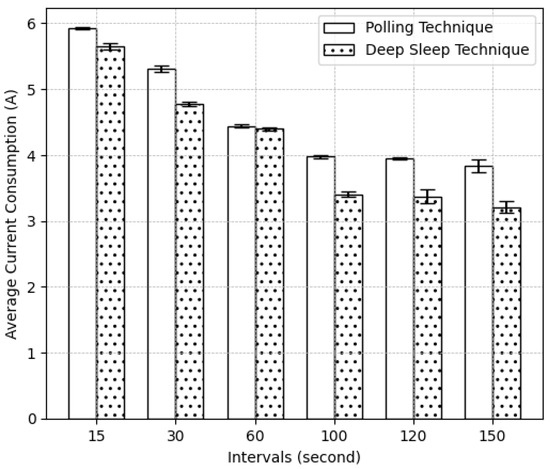 The bar chart in Figure 7 compares the average current consumption of the polling technique and the deep sleep technique across various time intervals (15, 30, 60, 100, 120, and 150 s). The polling technique consistently shows higher average current consumption, starting near 6 A at 15 s and decreasing to around 3.8 A at 150 s. In contrast, the deep sleep technique demonstrates lower average current consumption, beginning at approximately 5.6 A at 15 s (4.73%) and reducing to about 3.2 A at 150 s (16.45%). The error bars, indicating variability, are relatively small for both techniques, suggesting consistent measurements. overall, the deep sleep technique appears more energy-efficient than the polling technique.