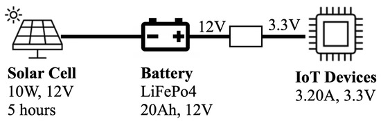 This section estimates the solar cell’s power source from Table 4 given an IoT device with a current consumption of 3.20 A over 40 times. Hence, it consumes 0.08 A per time. To run an IoT device that continuously consumes 0.08 A per hour for seven days, we would need a battery with a capacity of approximately 15.81 Ah (≈20 Ah in the market). This calculation considers a total operational time of 168 h over the week and includes an efficiency factor of 0.85 to account for potential system inefficiencies.