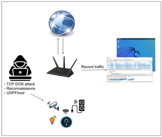 The traffic generated between the IoT device, attacker, internet, and all network traffic during these attacks was collected using Wireshark installed on Kali Linux as mentioned in the network configuration, then saved in a pcapng format for later analysis.