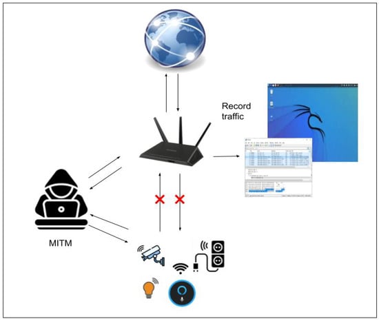 Figure 3. Man-in-the-Middle attack. - Deauthentication Attack: Deauthentication attacks were selected due to their ability to disrupt IoT devices by disconnecting them from their wireless networks. Since most IoT devices rely on Wi-Fi, such an attack causes significant service disruption; see Figure 4. This causes the user to lose access to the internet and all network services until they reconnect. As previously mentioned, the IoT device is wirelessly connected to the access point, providing IPs within the range of 192.168.2.2/254, and the attacker (for this attack) is not connected to the access point. The attacker achieves this by sending a fake request to the access point, causing the user’s device to disconnect.