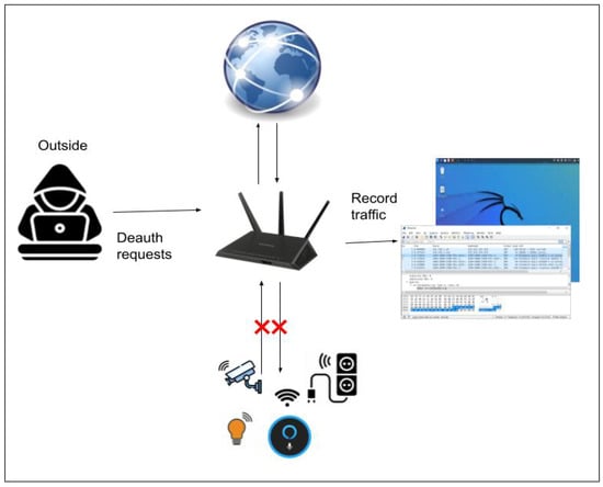 In these scenarios, the attacks are mainly either coming from the inside or outside. In an outside attack simulation, the attacker is not a part of the smart home network, while in an inside attack, the attack can be initiated by compromised or malicious nodes that are part of the network. The IoT device and attacker are connected wirelessly to the access point, providing IPs in the range 192.168.2.2/254.