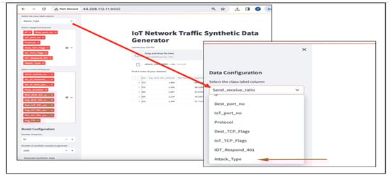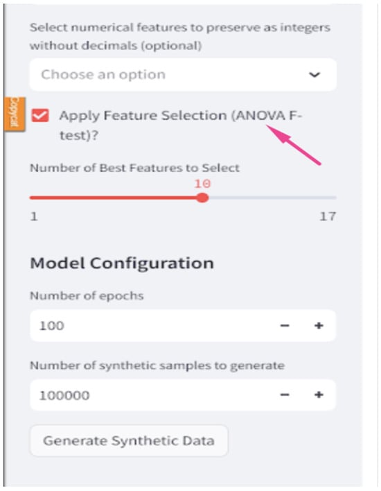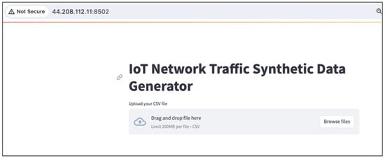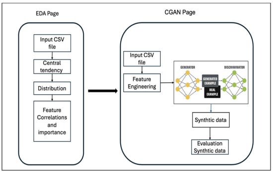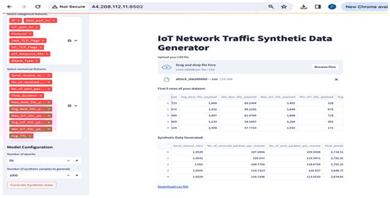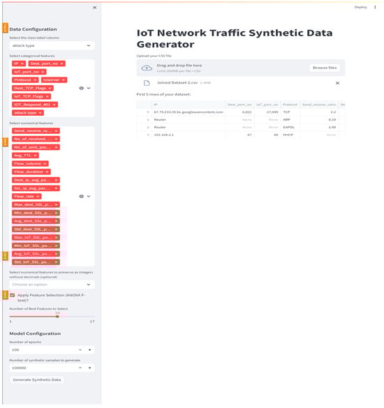 This research builds on previous studies highlighting the importance of synthetic data generation in cybersecurity. For instance, Kumar and Sinha [] utilized a Wasserstein CGAN model to generate synthetic IDS datasets, demonstrating significant improvements in detection performance. Similarly, Liu et al. [] introduced GAN-FS, a GAN-based oversampling technique combined with feature selection, which effectively addressed class imbalance and high dimensionality in IDS datasets. These studies underscore the potential of GANs in enhancing IDS by providing high-quality synthetic datasets. The proposed CGAN-based tool called “Synthetic Data Generator Tool” is designed to generate realistic and balanced synthetic datasets for IDSs in IoT environments. The objectives of the proposed Synthetic Data Generator Tool are not only to address the class imbalance issue but also to offer a comprehensive statistical dashboard for data analysis. This feature is particularly beneficial for researchers who want to understand the underlying patterns and distributions within their datasets. Furthermore, the tool incorporates advanced feature engineering techniques to rank the importance of features, thereby aiding in the development of more robust IDS models.