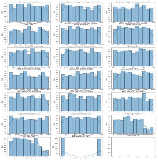 The CICIDS2017 dataset [] is intended for use in network intrusion detection and prevention systems. It contains various types of attacks, including DDoS, brute force, and botnet, as well as normal traffic, to replicate real-world scenarios. The dataset comprises 80 network traffic features, but its large size (∼70 GB) and high dimensionality make feature selection and model training more complex. Additionally, class imbalance issues can affect model performance.