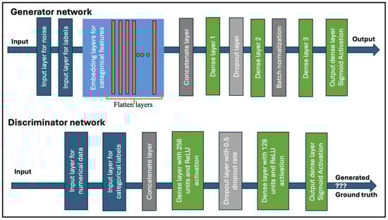 It is important to note that our dataset was imbalanced, with the majority classes being DOS and reconnaissance. This is typical as DOS attacks, for example, are launched from thousands of destinations simultaneously, while other attacks are from a single IP. Additionally, reconnaissance attacks can be launched against thousands of ports simultaneously. We acknowledge that developing ML and DL models to predict attack types would be challenging, especially ones intended to be used in IDS systems. There is a great need for our dataset to be balanced so that it can be used effectively in other predictive systems. Therefore, training a CGAN to accurately generate synthetic data while being conditioned by the types of network attacks, particularly minority ones, such as Man in the Middle (MitM) and denial of service (DoS), is highly in demand in the case of our multi-class Joint Dataset.