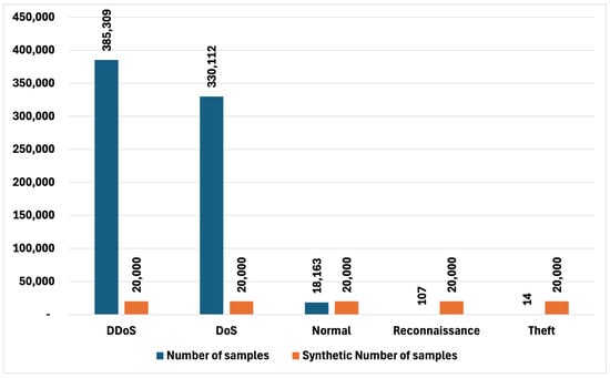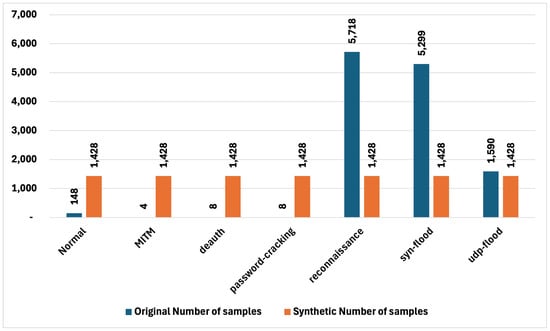 Our dataset consisted of a total of 12,779 instances, with 148 normal traffic examples and five categories of attack: MITM (Man-in-the-Middle), UDP-DOS (User Datagram Protocol Denial of Service), browser password cracking, deauthentication attacks, DOS-SYN (Denial of Service–SYN Flood), and reconnaissance. It is a multi-class dataset that, unlike traditional IoT intrusion detection datasets, does not only consider binary outputs (normal/attack), which often limit the feasibility of using of such datasets in real-world scenarios. Moreover, a multi-class dataset is essential for our research focus, i.e., developing a robust synthetic data generation model that is capable of realistically creating attack type instances that can be used in ML or IDS applications