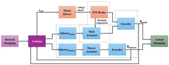 Figure 1 presents the network flow diagram of the system. The desired damping is directed into Arduino mega 2560 microcontroller (ATmega2560). The macro and mini actuator along with their sensors (encoders), forming an integrated network. The mini actuator, macro actuator, and EM brake, collectively make up another network that adjusts damping through rotational speed monitoring. The encoder measures the rotational speed and position of the mini actuator, which shares a common axis with the EM brake, thus aligning their rotational speeds. The Arduino reads the rotational speed, position, and current (corresponding to instant torque). The rotational speed of the EM brake rotor is read and a reference is computed, and a voltage signal is applied to the EM brake to adjust damping as required.