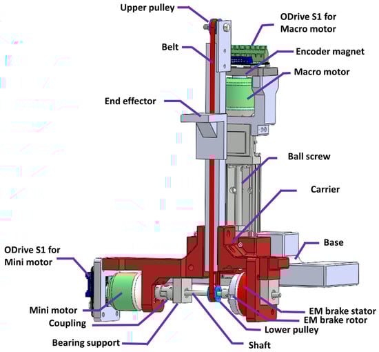 Figure 4 displays the CAD rendering of the macro–mini linear actuator. For the macro unit, a single-axis actuator (MISUMI’s LX2605, Tokyo, Japan) with a screw shaft diameter of 8 mm, a lead length of 5 mm, and an effective stroke of 72 mm is selected. A custom housing is designed to mount a brushless DC motor (Surpass Hobby’s C5055, Shenzhen, China) for driving the ball screw. The mini assembly is mounted on the carrier, which is affixed to the nut bracket of the ball screw of the macro unit. A pulley-belt mechanism employing a 10 mm radius for both pulleys is utilized on the moving carrier. The vertical translation of the end effector is facilitated by a three-roller slider traveling along the slot of the aluminum extrusion. With this design parameter, the end effector travels around 62.8 mm per revolution of the mini motor’s (or the EM brake rotor’s) rotation. The transmission ratio of the mini system is significantly lower than that of the macro system (around 12.6 times, when considering the 5 mm lead length). For an actual scaled prototype designed for supporting the body weight of a human, the lead length of the ball screw should be decreased (to achieve higher force from the macro system) while the radius of the pulleys can be maintained (or slightly increased), which results in higher differences between the gear ratios of the macro and the mini systems.