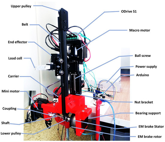 Figure 2 depicts the concept of the macro–mini linear actuator employing the EM brake. The actuator comprises the high-force unit (macro) and the low-impedance unit (mini). The macro motor propels the vertical displacement of the carrier via the high-force (non-back-drive) ball screw. The end effector is driven by the (low-inertia) mini motor through the highly back-drivable pulley-belt mechanism for high-frequency motion. For an active body-weight-support system for gait training, the end effector of the actuator is connected to a patient’s body through harnesses. The interaction force from the human is applied to the actuator at the end effector. The EM brake rotor is concentrically connected to the same pulley as the mini motor. The stator of the EM brake and the mini motor are mounted on the moving carrier.
