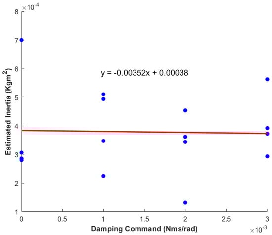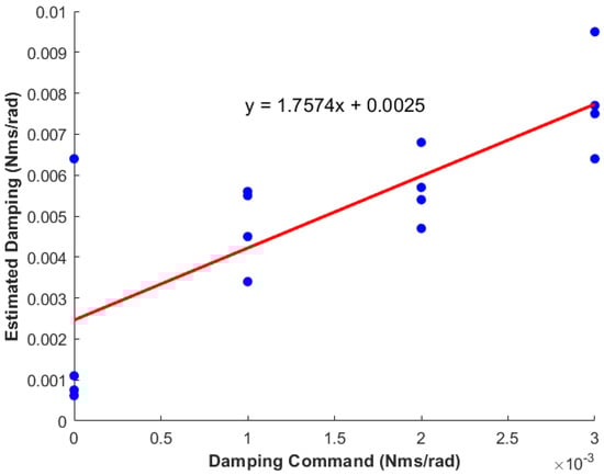 Figure 6 illustrates the estimated damping plotted against the commanded damping. A positive relationship is evident from the linear trendline. Although the slope of the trendline is not precisely equal to 1, it remains within the same order. The intrinsic damping of the system (stemming from viscous components such as bearings) is discernible from the intersection with the vertical axis, ~0.0025 N·m·s/rad. As depicted in Figure 7, the estimated inertia of the mini actuation system is ~3.9 × 10−4 kg·m2. The variation in the commanded damping has a negligible influence on the system’s inertia (as indicated by the nearly horizontal trendline).