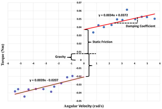 Driving torque required from the mini motor to move the end effector at constant speeds. Positive angular velocity corresponds to upward motion and vice versa. The slope of the velocity–torque relationship reflects the intrinsic damping. Static friction is estimated from half of the offset between the intersections of the trendlines with the vertical axis. The influence of gravity is evident in the vertical shift of the starting torque.