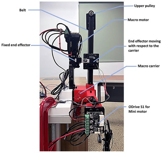 In this study, position control of the macro carrier is accomplished using the ODrive S1. However, alternative drive solutions may be employed for more straightforward applications. Owing to limitations in the mini motor’s capacity to characterize the damping force generated by the EM brake, we adjusted the setup to enable the macro unit to drive the end effector against the resistance torque of the EM brake, as detailed in Section 4.