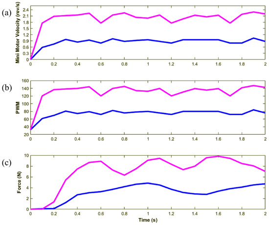 This experiment utilized the macro motor to elevate the carrier at two distinct speeds. Owing to the fixed position of the end effector, linear motion was induced in the pulley-belt mechanism. The rotational speed of the mini motor, which is equivalent to that of the brake rotor, was recorded, as plotted in Figure 10a. The brake torque was adjusted to achieve the desired damping value, with the PWM command computed using Equation (5) and plotted in Figure 10b. At the beginning, when the speed was very low, the computed PWM began from a non-zero value following the first term of Equation (7). The interaction force measured at the stationary endpoint is depicted in Figure 10c. The force increased with increasing speed with a response time of approximately 0.5 s. The force plots exhibited uneven profiles owing to the slight misalignment between the rotor and the brake stator. The frequencies of these fluctuations corresponded to the rotating speeds of the brake.