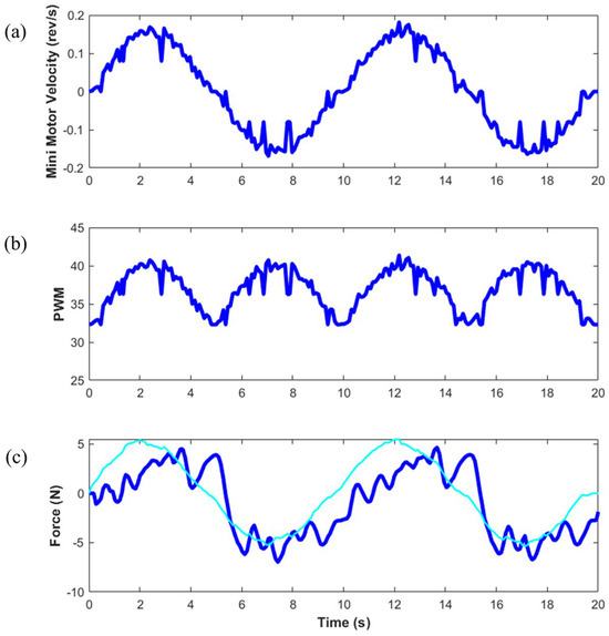 Response to the sinusoidal velocity reference of frequency 0.1 Hz. (a) Recorded angular velocity of the mini motor. (b) PWM command for the EM brake. (c) Interaction force measured by the load cell. The cyan plot shows the ideal force directly computed from the rotational speed of mini the motor.