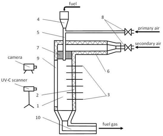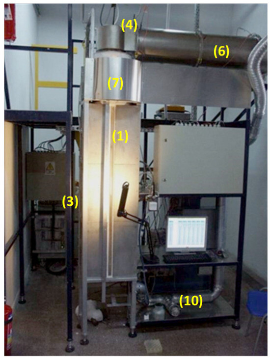 The combustion chamber (1) shown in Figure 1 and Figure 2 is a 1.5 m long drop tube with an internal diameter of 0.1 m, and it is made up of cylindrical heating elements (2). These elements ensure a constant temperature along the internal walls of the chamber. The combustion temperature is measured using thermocouples (3). The stand ensures almost perfect homogeneous conditions for fuel samples in the whole combustion chamber. Precise and even dosing of weighed portions of the pulverized fuel, with an accuracy of ±4%, is ensured by using a pneumatic feeder (4). The fuel is fed to the combustion chamber in the primary air stream through a thermally insulated water-cooled probe, which is a miniature dust-stream burner (5) with an internal diameter of the outlet nozzle of 12 mm. The temperature of the cooling water is stabilized to ensure constant thermal conditions for the fuel and to prevent its ignition inside the water-cooled probe. At the same time, the thermal insulation of the probe prevents the cooling of secondary air, which is the main oxidant stream. In order to maintain an even temperature distribution in the combustion chamber, and in particular in its initial section, the secondary air stream flows through the electric heater (6). The secondary air heater provides a gas stream at the inlet of the chamber at a temperature equal to the temperature of its walls. The maximum operating temperature of the chamber can be set to up to 1200 °C. In order to stabilize the flow rate of secondary air, a stabilizing insert (7) is placed at the inlet to the combustion chamber. The test stand is supplied with air from a compressor, and the primary and secondary air flows are controlled by means of precise electronic mass flow controllers (8). A sight glass in the form of a quartz tube (9) is installed along the entire combustion chamber. The combustion chamber outlet (10) is connected to the exhaust gas system, ensuring constant negative pressure in the combustion chamber. The measurement and control systems are connected to the data acquisition system. Additionally, the combustion process can be recorded in the visible light spectrum using a fast camera.
