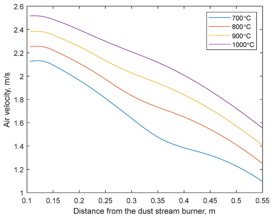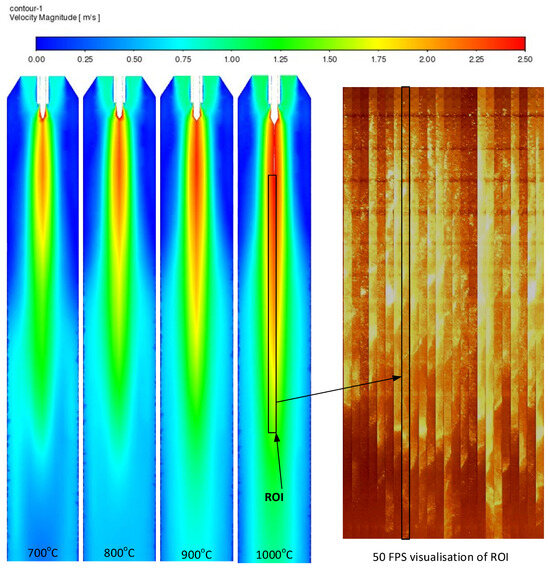 In each experiment, primary and secondary air flow rates (Table 2) are kept constant. Although the temperature in the combustion chamber is homogenous, air velocity profiles may vary depending on the temperature and the distance from the burner. The effect of temperature on the air velocity in the chamber has been determined numerically using CFD (computational fluid dynamics) techniques in the ANSYS-Fluent 15.0 software. A two-dimensional model of the combustion chamber was built and parametrized according to [53]. The simulated velocity profiles with a specified region of interest (ROI) are shown in Figure 3. The ROI is compared with images captured every 20 ms by the high-speed camera located at the distance of 0.1–0.55 m from the burner (Figure 1). The selected range covers the most important parts of the flame, and Figure 4 shows the air velocities obtained numerically for different combustion temperatures.