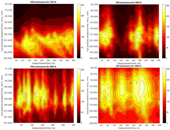 Then, the luminance is normalized and scaled using the cubic interpolation method. Finally, using the velocity profiles (Figure 4), it is possible to calculate the residence times of the coal particles at different distances from the burner. The residence times were calculated by integrating the reciprocals of the average velocity of air for specified distances (Figure 4). The obtained results are portrayed in Figure 5 in the form of luminance maps for the ROI at different combustion temperatures. The numerical results also show that the measured signals have a spatiotemporal character; thus, it is not possible to specify a representative location of an optical sensor to gather complete information on the combustion process and its intensity. As can be noticed, the residence time of coal particles is smaller for higher combustion temperatures. However, a visual image that allows the flame to be observed over a wide range of ROIs is not sufficient to assess the combustion process. Due to these reasons, further analysis was based on UV radiation measurements in the range corresponding to the UV-C spectrum (200 to 280 nm). Observations made in this range allow us to characterize devolatilization processes for a specific fuel. This requires the UV scanner to be positioned at a single optimum measuring point that provides unambiguous information about the combustion process.