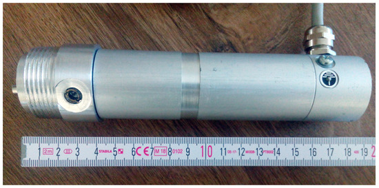 The chassis of the scanner is made of aluminum with a threaded connector (1¼”) to fix the scanner to the sight glass and Whitworth thread to attach the scanner to a tripod. The UV scanner uses a SiC sensor due to its high sensitivity, good spectral properties, insensitivity to visible and infrared light, and resistance to high temperatures. In this study, UV-TIAMO sensors from Roithner Lasertechnik (Vienna, Austria) are used. These sensors can detect UV-B and UV-C radiation (wavelengths between 215 nm and 365 nm) and include a transimpedance amplifier that produces an output voltage in the range between 0 and 5 V.