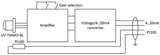 The UV-TIAMO sensors differ in their sensitivity, dynamical responses, and housing (with a diffuser or lens). In our case, two sensors were selected: UV-TIAMO-BL, with a lens and measurement range to 18 nW/cm2, and UV-TIAMO, which has a diffuser and measurement range of up to 18 µW/cm2. The measuring device includes the sensor, an amplifier with adjustable voltage gain (×1, ×10, or ×100), a voltage-to-current converter with 4–20 mA output, and a Pt100 temperature sensor with a transmitter. The structure of the UV device is shown in Figure 7.