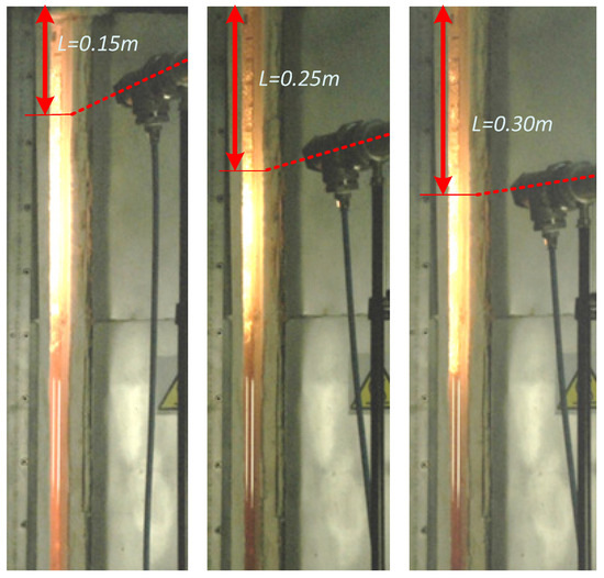 A series of experiments was carried out on the test bench for different combustion temperatures (range 700–1000 °C) and different positions of the UV scanner from the burner (range 0–0.6 m). Figure 9 explains what is meant by the distance L from the burner and shows three exemplary positions of the scanner at 0.15, 0.25, and 0.30 m with respect to the burner. The exact values of the parameters of the experiments are shown in Table 2. During each experiment, UV signals were recorded for preset time intervals not exceeding one minute.