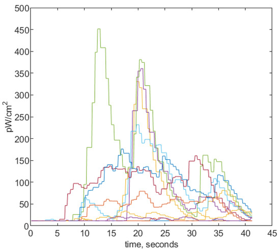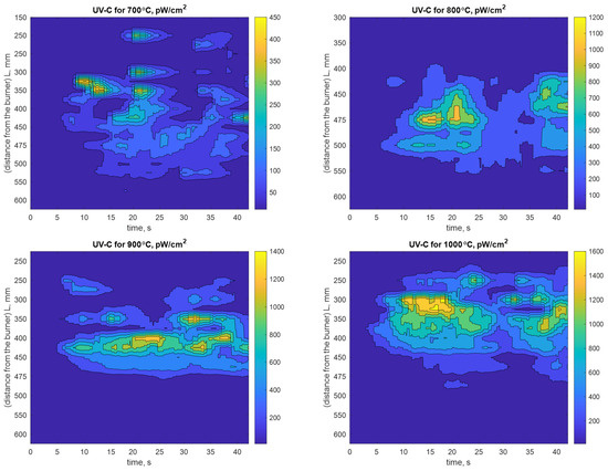 In turn, Figure 10 shows exemplary time signals recorded by the UV scanner for eleven different distances from the burner (in the range 0.15 m–0.6 m) and for a combustion temperature of 700 °C. The measured signals are expressed in pW/cm2, and they represent the instantaneous power density in the flame area observed by the scanner. The measurements shown in Figure 10 were repeated for temperatures of 800, 900, and 1000 °C. All the obtained results were averaged, and these are shown in Figure 11 in the form of the spatiotemporal distribution of UV radiation corresponding to the results shown in Figure 5 for different combustion temperatures.