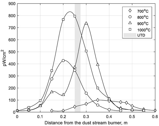 Mean UV radiation measured at different distances from the burner and at different combustion temperatures; UTD—unambiguous temperature-dependence region.