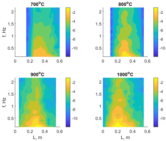 By using fast Fourier transform (FFT) with the Hanning window, the frequency spectra were calculated for the measured time–domain UV signals. For N = 512 samples and a sampling frequency fs = 10.9091 Hz, the resulting spectra had a resolution of 0.021 Hz. As the true bandwidth of the UV scanner is 1.97 Hz (Table 3), the analysis was performed within a range between fmin = 0.3 and fmax = 1.9 Hz. Figure 13 shows the magnitude spectra S(f) obtained for different combustion temperatures and different locations of the UV scanner. The magnitude spectra were normalized by dividing their values by the highest value obtained at 1000 °C. For better visualization of the differences, the scale of the z-axis is logarithmic, and the zero value corresponds to the maximum value of the normalized magnitude spectrum S(f).