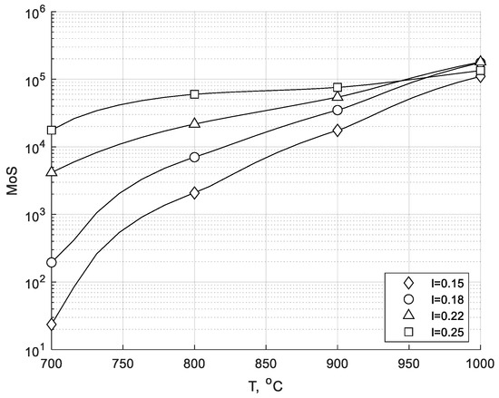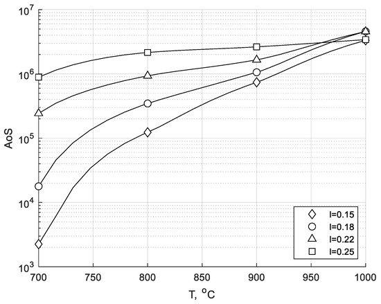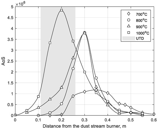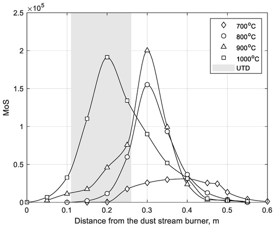 The analysis of the proposed indicators (Figure 14 and Figure 15) leads to similar conclusions. The maximum in the AoS (or MoS) distribution at 800 °C is shifted to the right and is very close to the maximum in the AoS (or MoS) distribution at 900 °C. In both cases, the UTD region is much wider than that shown in Figure 12. At a distance of 0.1 m to 0.25 m, unambiguous information on the combustion temperature, and thus the combustion intensity, can be obtained. This region is close to the root of the flame and, therefore, rich in free radicals. It seems that more precise measurements of the UV radiation at distances close to the burner outlet (L < 0.1 m) can extend the UTD range to the left. The analysis of the proposed indicators in the UTD range allows us to express the MoS and AoS as functions of the combustion temperature (Figure 16 and Figure 17). As these are monotonical functions of the combustion temperature, it is possible to measure the temperature of combustion by using a calibrated UV scanner.