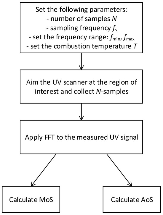 Finally, the proposed approach can be summarized as shown in the flowchart in Figure 18. After recording the UV signals, FFT is applied, and the magnitude spectrum S(f) is obtained. Then, the proposed indicators can be calculated.