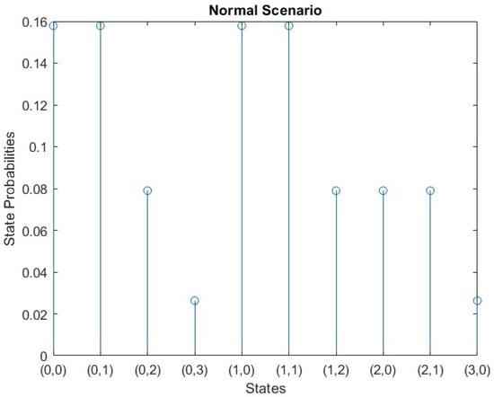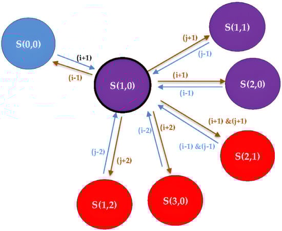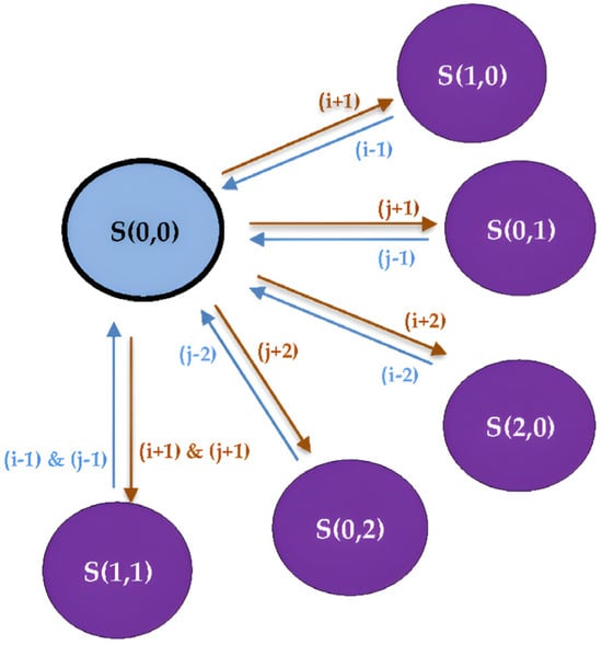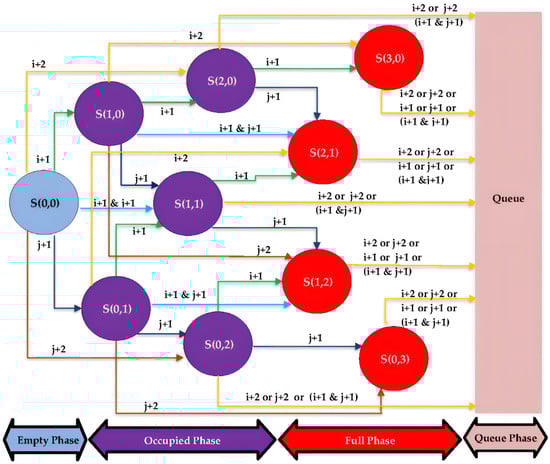 - Occupied Phase: It contains five states, S (1,0), S (0,1), S (1,1), S (2,0) and S (0,2).