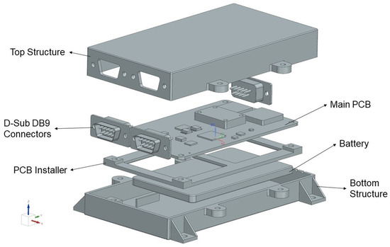 The system’s envelope is lowered from the preliminary version in [2] to mm, and the main system’s exploded view is presented in Figure 2. This figure allows the visualization of the several different components that form the main system.