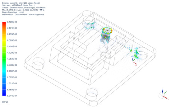 Thus, due to the low stress values, the deformation results are negligible. The highest deformation values are mm and mm for the main and exterior systems, respectively.