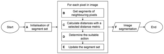 In the beginning, the segment set is initialised as an empty set (block A in Figure 1). Then, the RSM iterates through I in a scan-line order (see Figure 2). After a pixel is reached, segments of neighbouring pixels are obtained (block B). The distances are calculated with the selected distance metric d (block C), based on which an action A is determined (block D). According to the local neighbourhood, is assigned to the segment (already existing or newly created). The partial result of the segmentation is stored in a set of edge-connected segments (block E). After all pixels in I are processed, contains the final result of the segmentation (block F). The pseudocode at the end of this section gives the details of the algorithm.