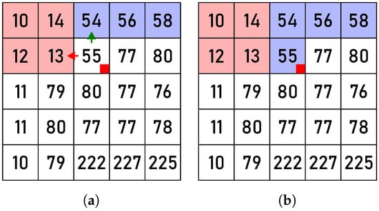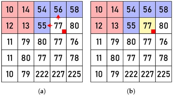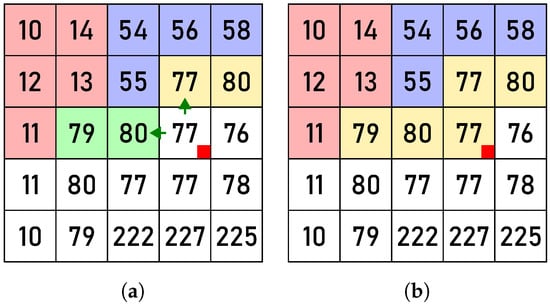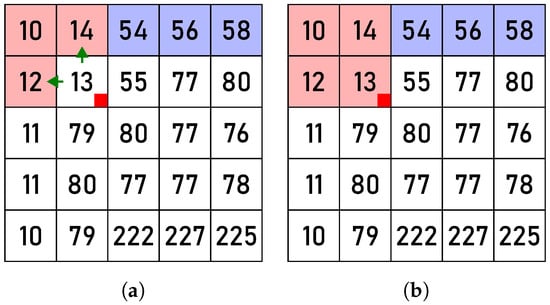 Figure 7. The action New: before (a) and after (b) the processing of pixel , marked by a red square. The red arrows indicate that .